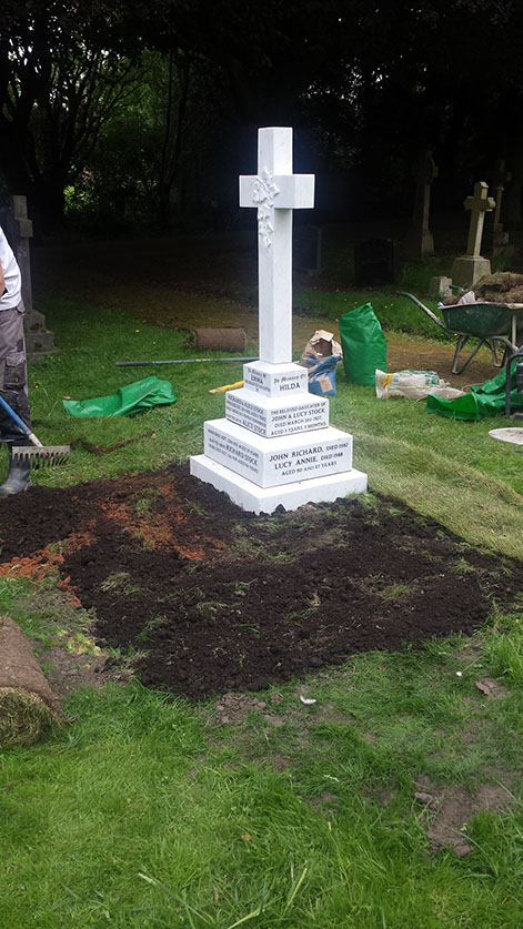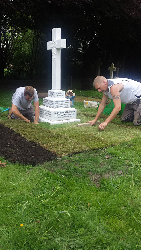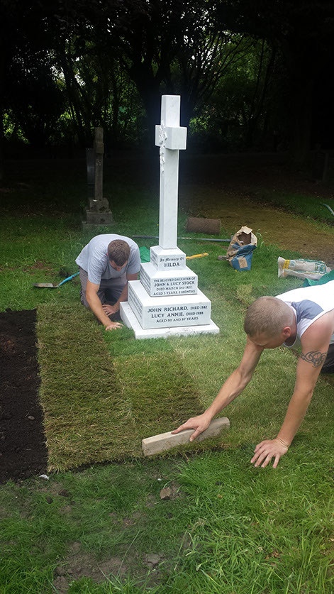 Our stone masons can be seen here laying the new turf to the grave area and checking the level of the ground surrounding the grave.