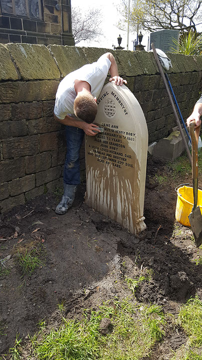 Our stone masons can be seen here removing ground from behind the stone in preparation for the levelling of the ground and the re-turfing of the grave as requested.
